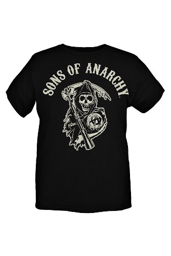 This T-shirt features a sons of Anarchy motorcycle club logo featuring the grim reaper wielding an M-16 with a bloody scythe blade and holding a crystal ball with the anarchy "A."Available at Amazon Check Price Now!
